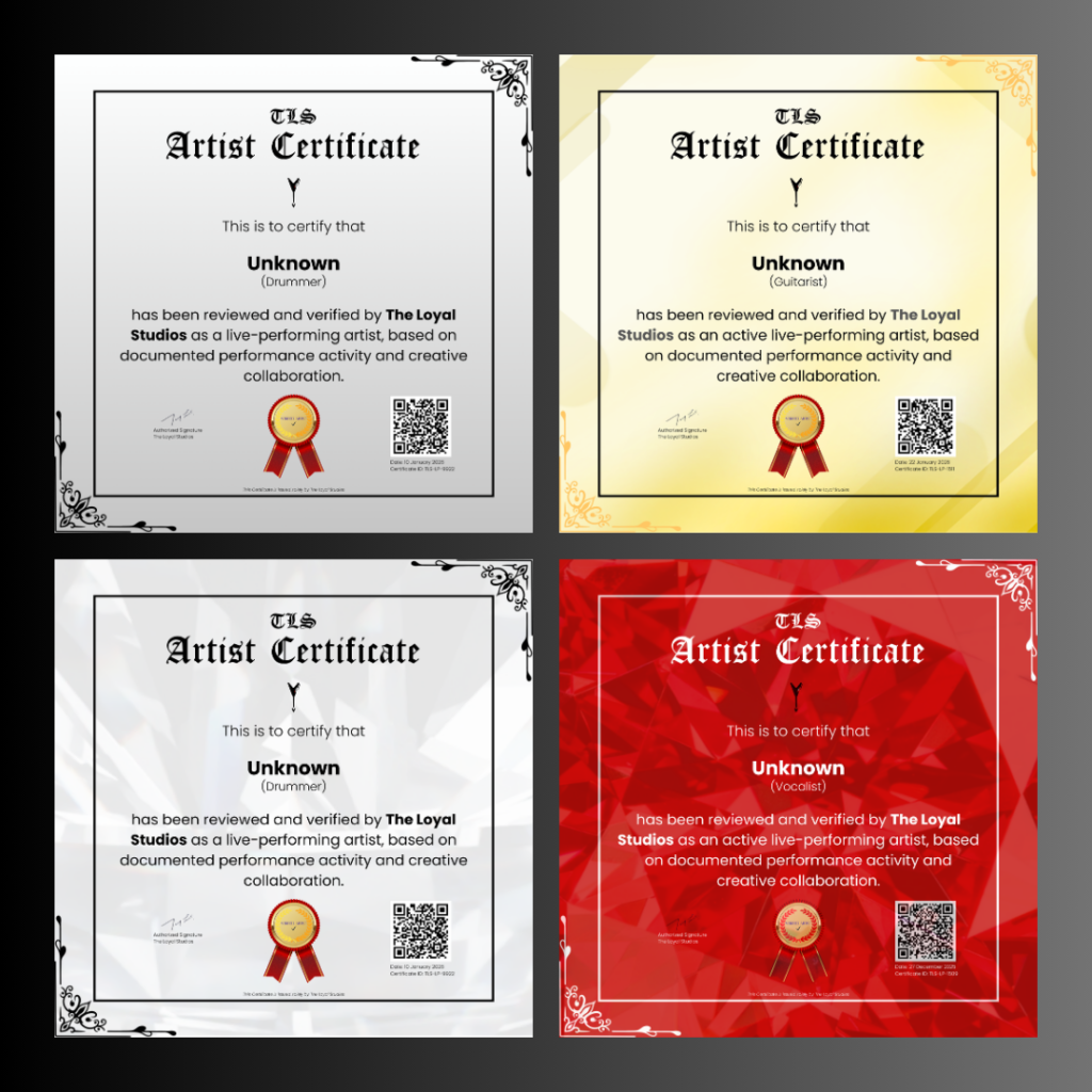 The TLS Artist Certificate provides official recognition to artists who are actively performing live. It validates an artist’s experience based on documented shows, gigs, and live performances, making the recognition meaningful and merit-based.